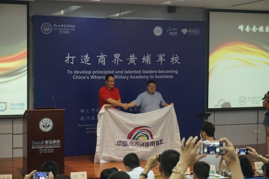 MBA华南联盟轮值主席卢子亮将会旗交接给华南师范大学MBA联合会主席陈秋明