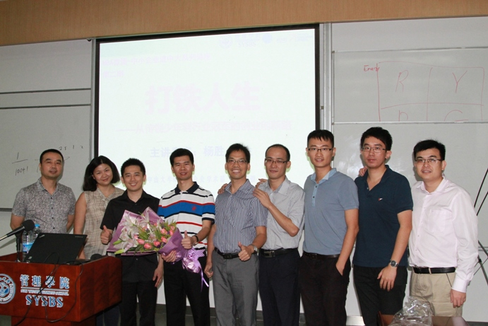 讲座在杨胜先生风趣幽默的自我介绍中欢乐开场。他创业前的从业经历可谓丰富多彩,从第一次的陌生拜访,到徒步从中大走到江南西,从做保险,到做传销,卖袜子、卖牙刷、卖纸皮,连做模具的技术活也做过。在这么多年的工作历练中,他摸爬滚打,总结出了做人的四个字“吃苦、吃亏”。