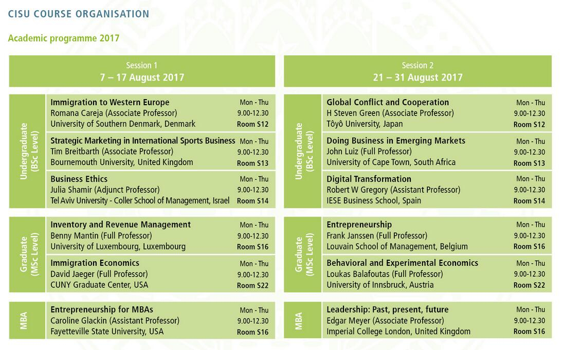 Classes are scheduled from Monday to Thursday, 9 am 12.30 pm and usually end with a final exam or presentation on the last day. The following overview is intended to give you a general idea of courses we offer.