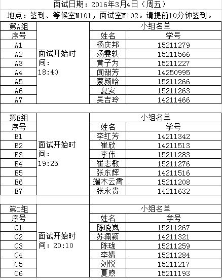 2. 面试形式:每组面试时间约为45分钟,具体分组名单请见附件。