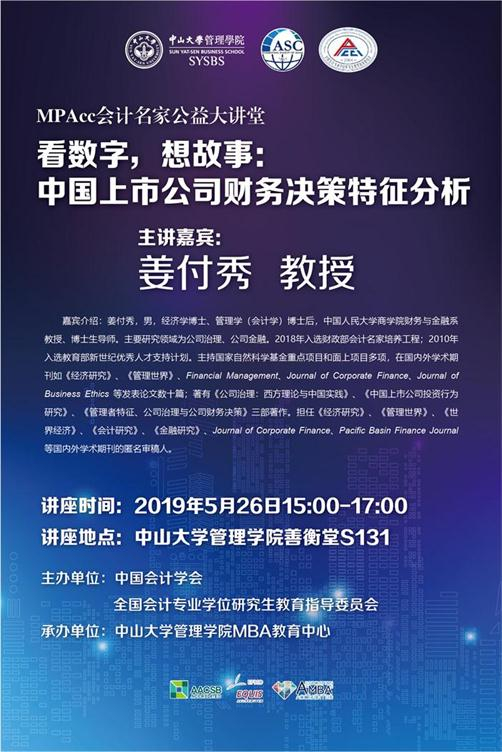 “MPAcc会计名家公益大讲堂”是中国会计学会、全国会计专业学位研究生教育指导委员会联合发起的全国性公益活动,旨在充分发挥会计名家在引领和推动我国会计教育持续繁荣发展中的重要作用,为MPAcc学员提供更多与会计知名学者学习、交流的机会,提升MPAcc学员的综合素质。