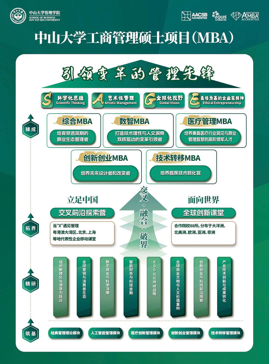 "构建了完善的MBA 培养体系,涵盖筑基、精研、拓界、臻成阶段,设置多种课程模块与项目方向,借助交叉前沿探索营、全球创新课堂等,培养能够引领变革的管理先锋。"